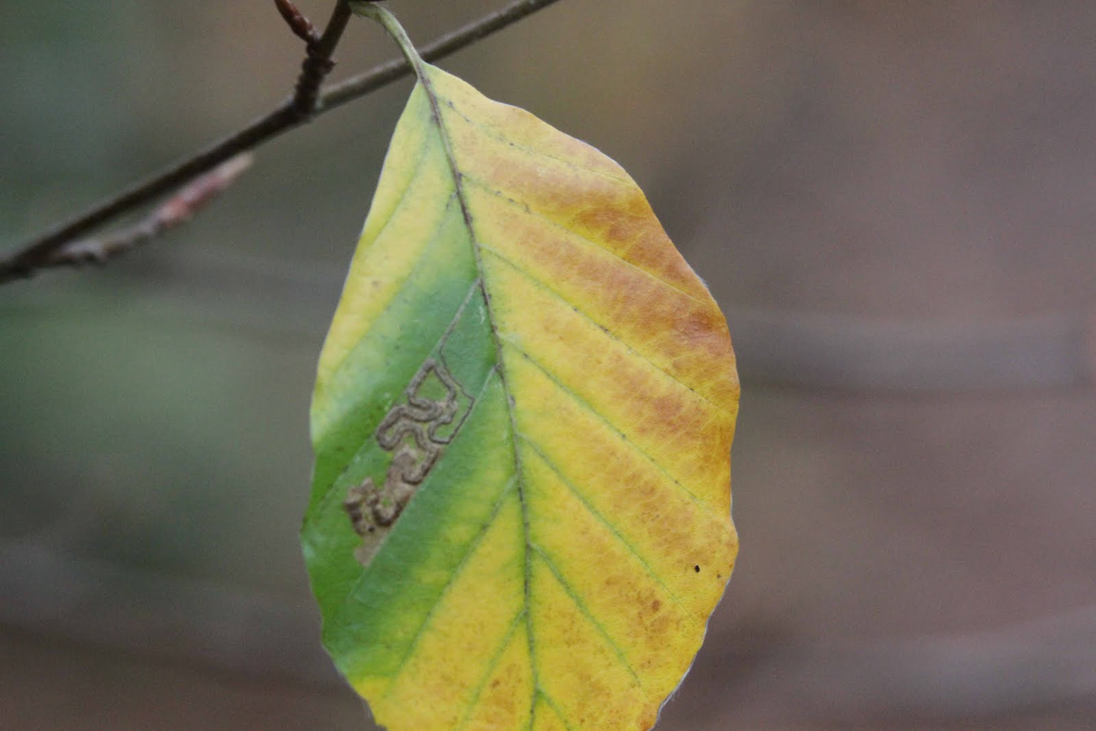 The effect is however not confined just to Stigmella, as seen in this Phyllonorycter maestingella mine found further down the side track. Could this be an example of convergent evolution?